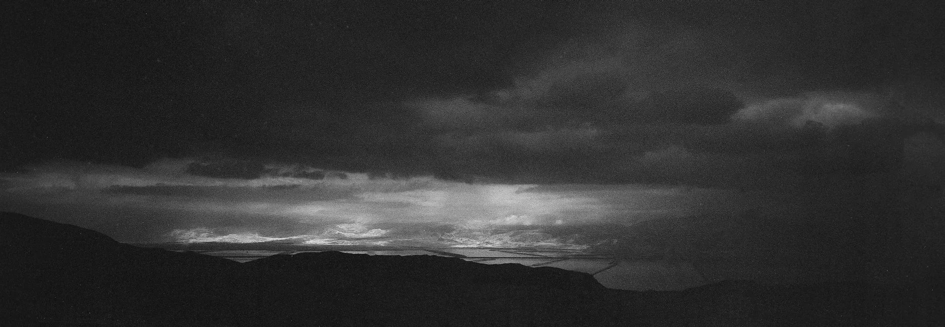 Human figures are almost entirely absent from most of the photographs, except for two works. In the first, entitled One, a lone man is seen walking, his head bowed; he appears almost miniature against the backdrop of the desert mountains. In the work Dusk, dark human silhouettes search for meaning along the shoreline, no different than the birds collecting crumbs at the forefront of the photograph. The heavy clouds and the grainy quality of the photograph merge to create an apocalyptic atmosphere. Similar to the absent sea, even when humans are missing from the landscape, the damage they create and the distress they feel are present in all photographs.